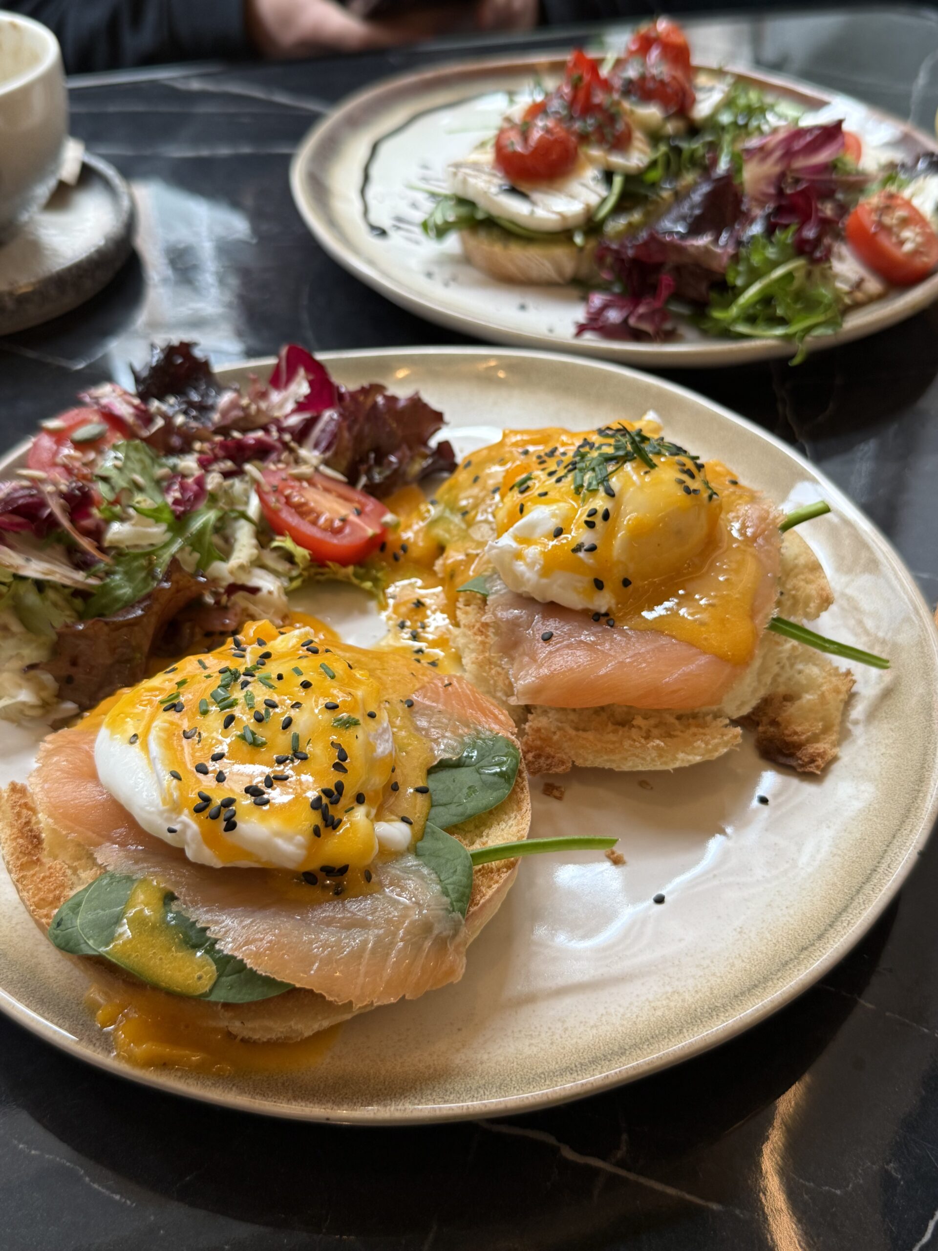Sourdough toast with smoked salmon, caviar, cream cheese, poached egg, chives oil & mixed greens