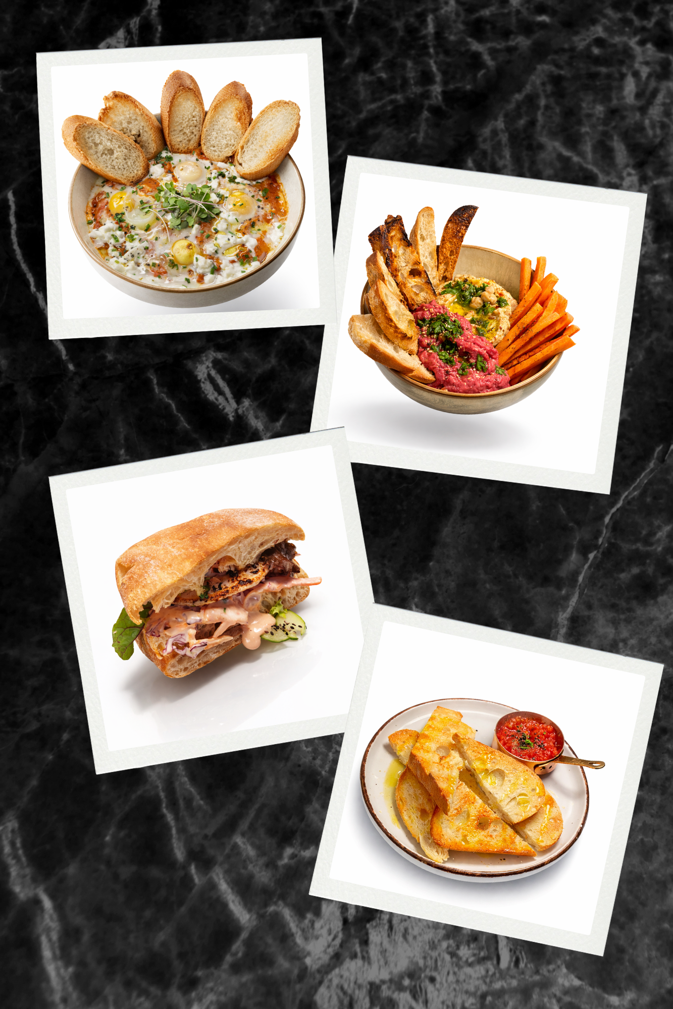Rustic slow-cooked tomato and pepper sauce, quail eggs, melted fresh mozzarella and spring onion, served with slices of artisanal bread.