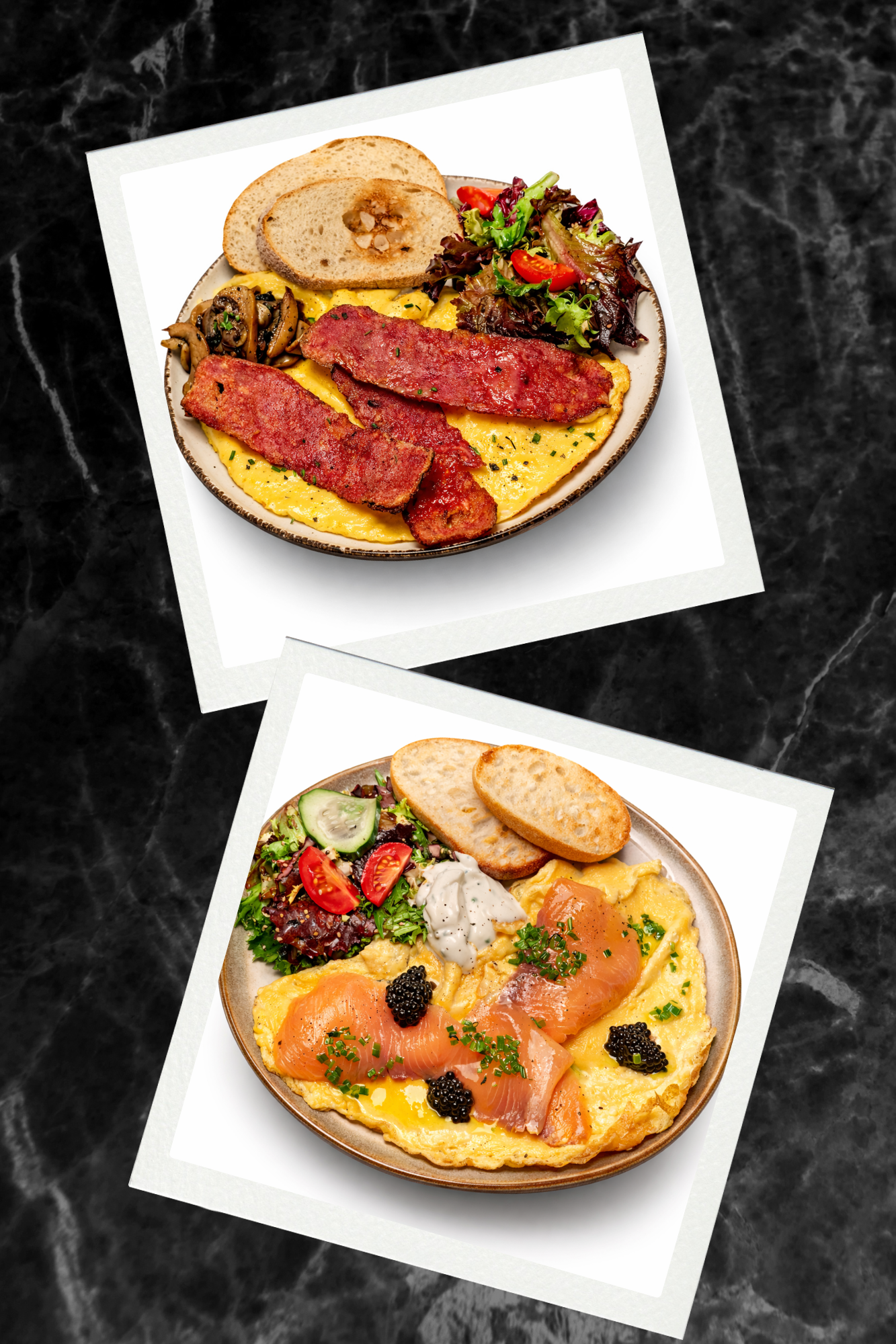 Crispy bacon, Toasted sourdough butter & chives Per plate: 680 kcal · 50g fat · 30g carbs · 30g protein