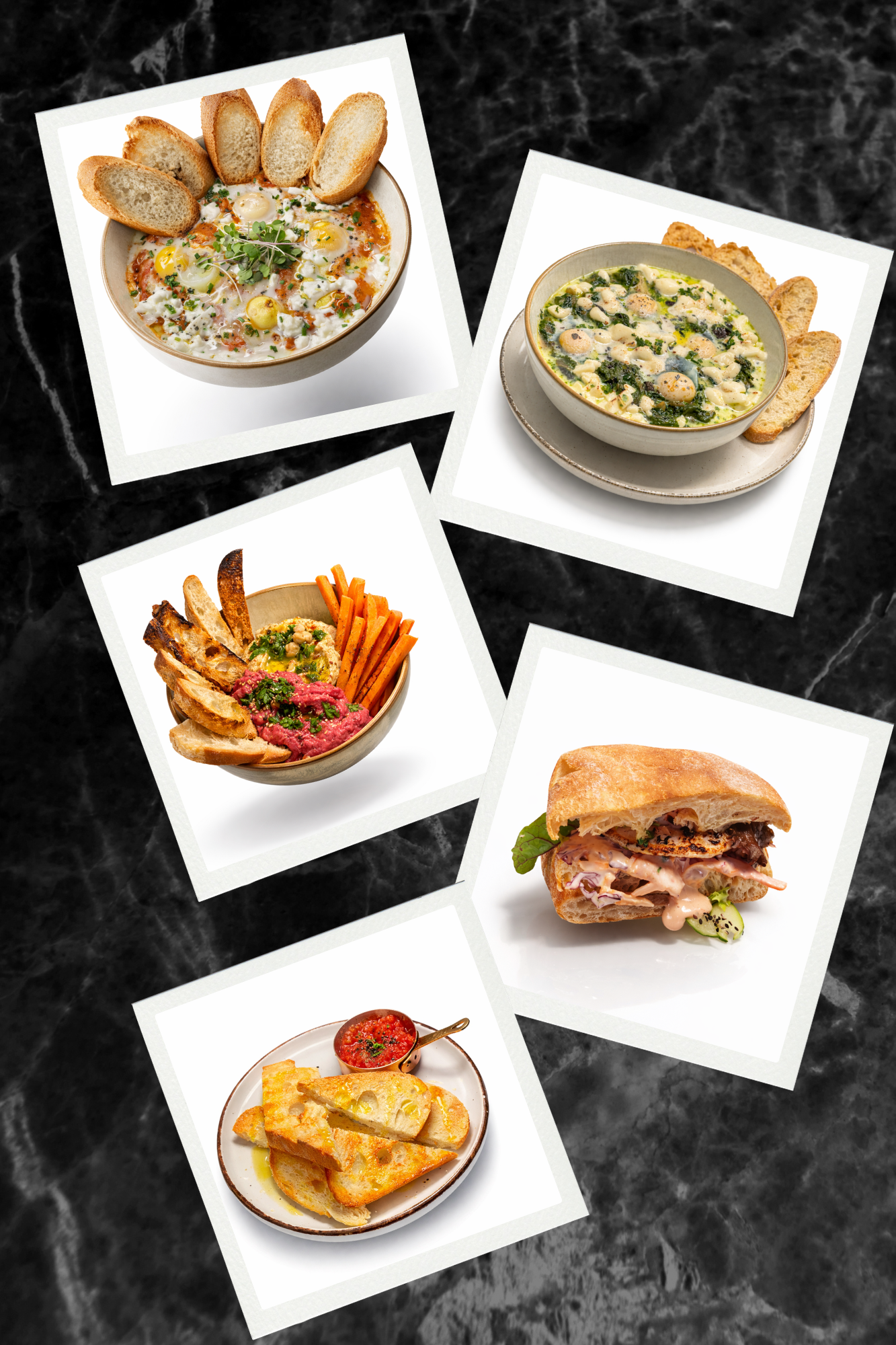 Rustic slow-cooked tomato and pepper sauce, quail eggs, melted fresh mozzarella and spring onion, served with slices of artisanal bread. Per plate: 520 kcal · 28g fat · 34g carbs · 31g protein
