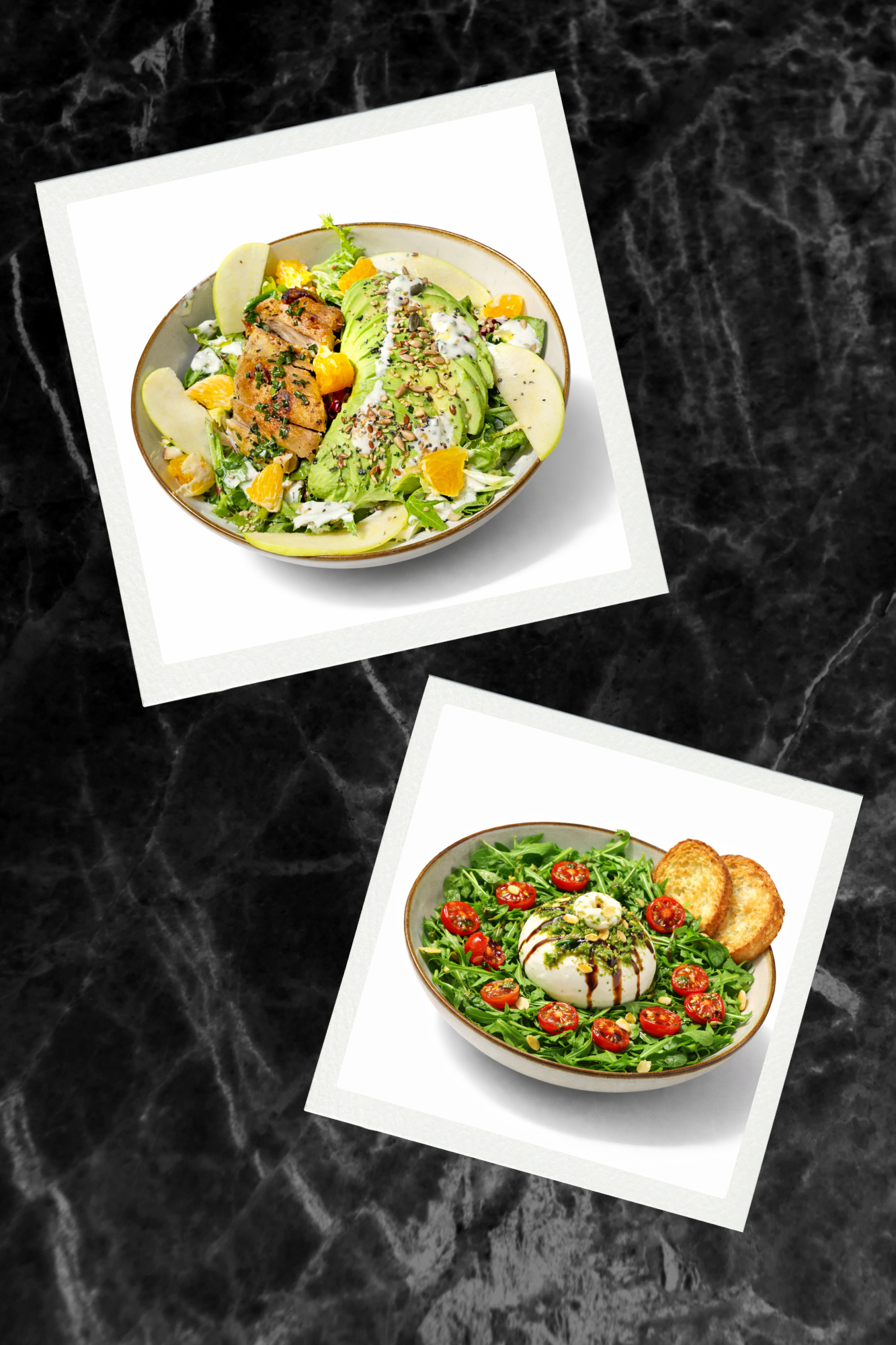 Fresh mix of arugula and spinach topped with whole burrata, served with cherry tomatoes sautéed in olive oil. Finished with a touch of pesto, balsamic reduction, and toasted almonds, alongside crispy toasted bread. Per plate: 620 kcal · 42g fat · 34g carbs · 20g protein